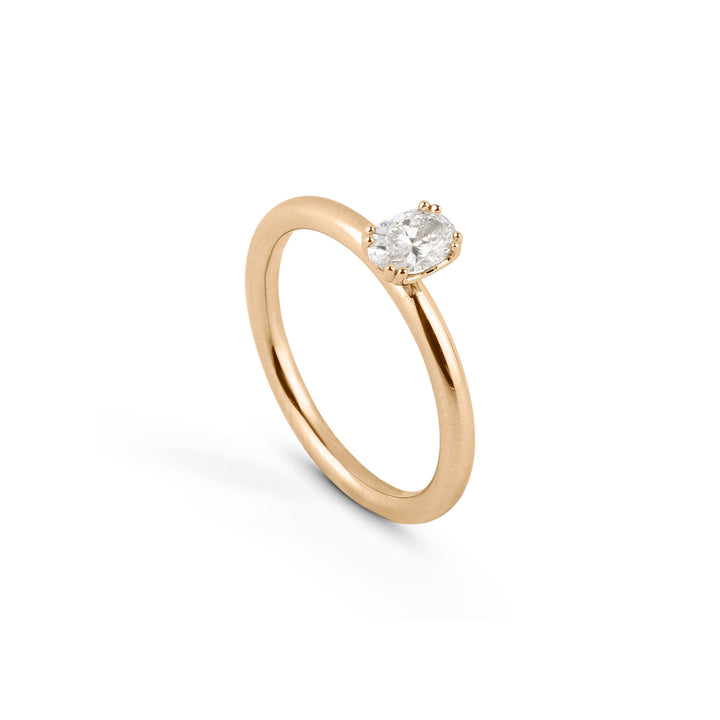 Anga is a sophisticated solitaire ring where an oval-cut diamond catches the eye with its soft shape and subtle luster. The beautiful four-prong setting lifts the stone with ease and lets its unique proportions come into their own.